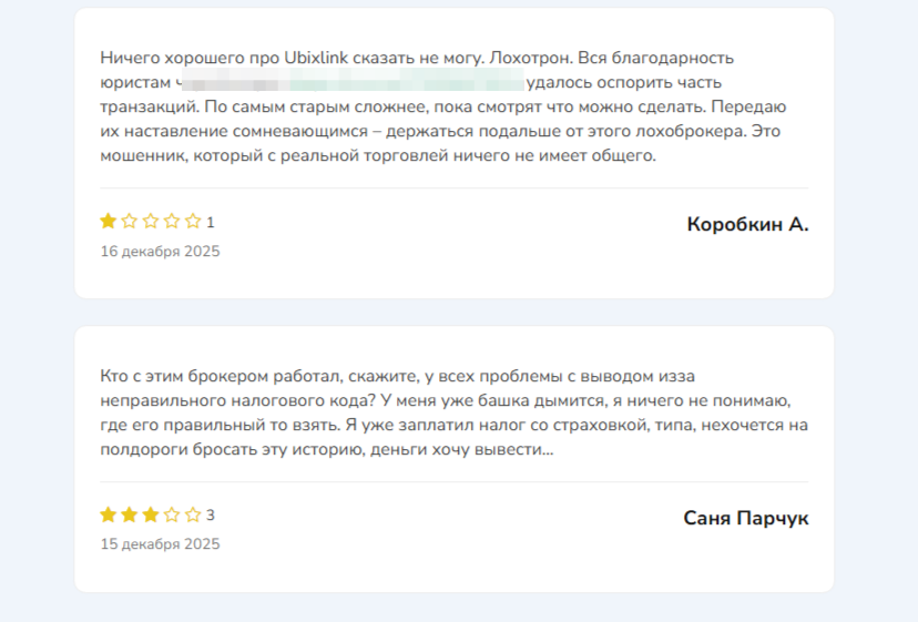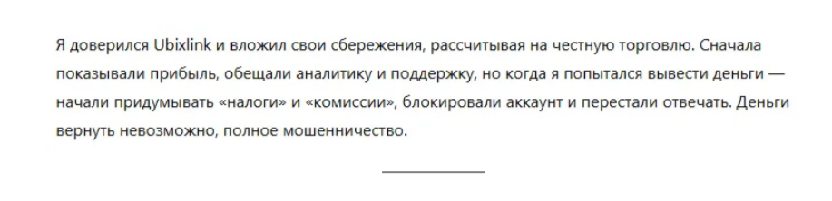 Пользователи крайне негативно отзываются о работе площадки. Самая частая претензия, что брокер Ubixlink не дает вывести деньги со счета. Представители компании придумывают сотни причин, чтобы отказать в получении денег. Организовывают дополнительные проверки личности, источников получения денег и пр. Каждый проверочный этап сопровождается дополнительной комиссией, о которой заранее не сообщается. С каждым разом сумма возрастает. На конечном этапе выясняется, что для получения перевода нужно оплатить услуги гаранта, иначе банк заблокируют операцию. Выманив у пользователя все деньги, брокер блокирует аккаунт и перестает выходить на связь. Обращение пострадавших в различные инстанции, в том числе и в полицию, как правило, результата не приносит. Биржа работает нелегально и вернуть украденное невозможно.