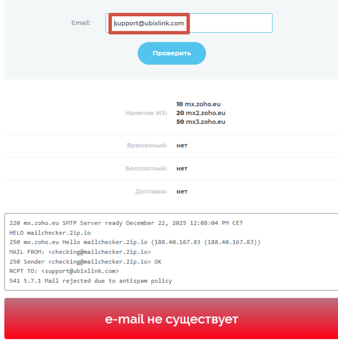 Также мы выяснили, что указанной электронной почты не существует.