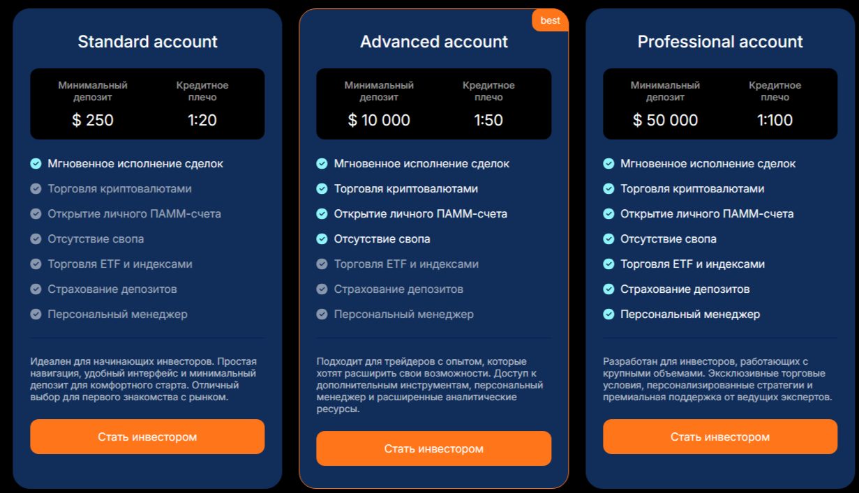 2. Advanced account. Этот аккаунт выбирают опытные трейдеры, которые уверены в своих силах. Начальная сумма начинается с 10 тысяч долларов.