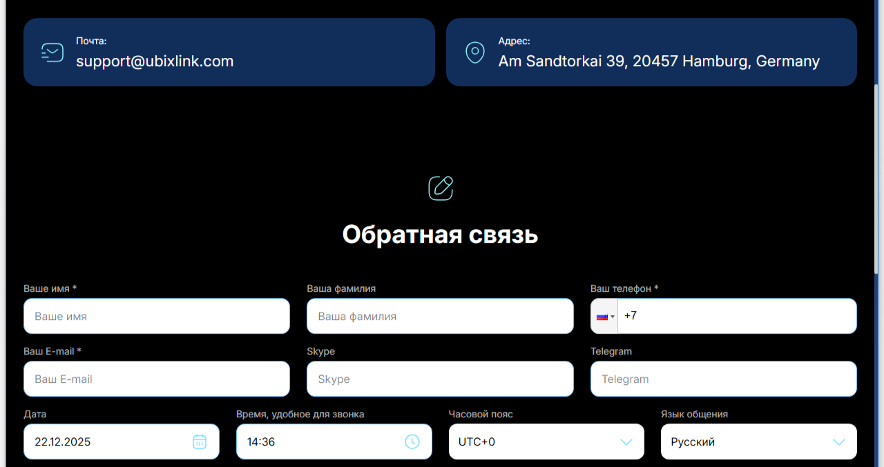 Вкладка с контактами содержит форму для обратной связи, адрес головного офиса и емайл ubix ln info.