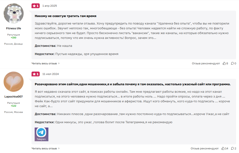 • отзывы о телеграмм-канале «Удаленка без опыта» негативные и предупреждают о пустой трате времени;