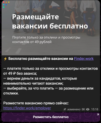 • комментарии к постам канала закрыты, то есть подписчики лишены возможности публично обсуждать вакансии, делиться опытом или задавать вопросы;