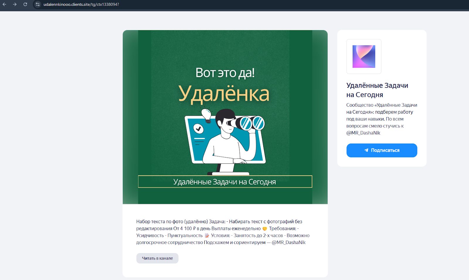 Также контент из телеграмм-канала «Удаленные задачи на сегодня» дублируют в рамках ресурса udalennkinooo clients site. Это обычный лендинг «прокладка», построенный на базе конструктора от «Яндекса», через который дополнительно привлекают аудиторию.