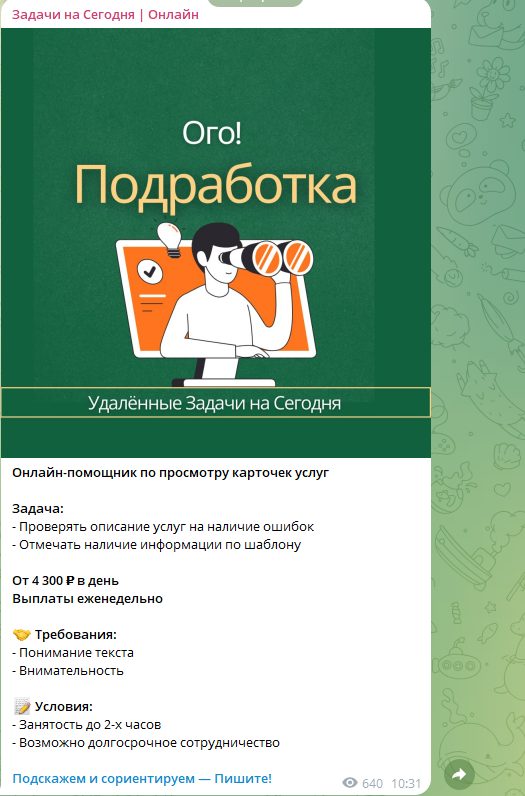 На то, что телеграм-канал «Удаленные задачи на сегодня» может быть скамом, указывают сами вакансии, поскольку пользователям предлагают слишком высокую оплату за простые действия. Например, в феврале 2026-го клиентам предлагают возможность просматривать карточки товаров на предмет ошибок и получать за это от ₽4,300 в день.