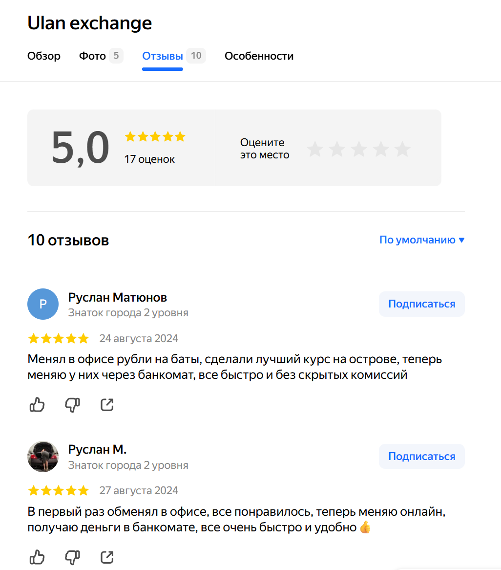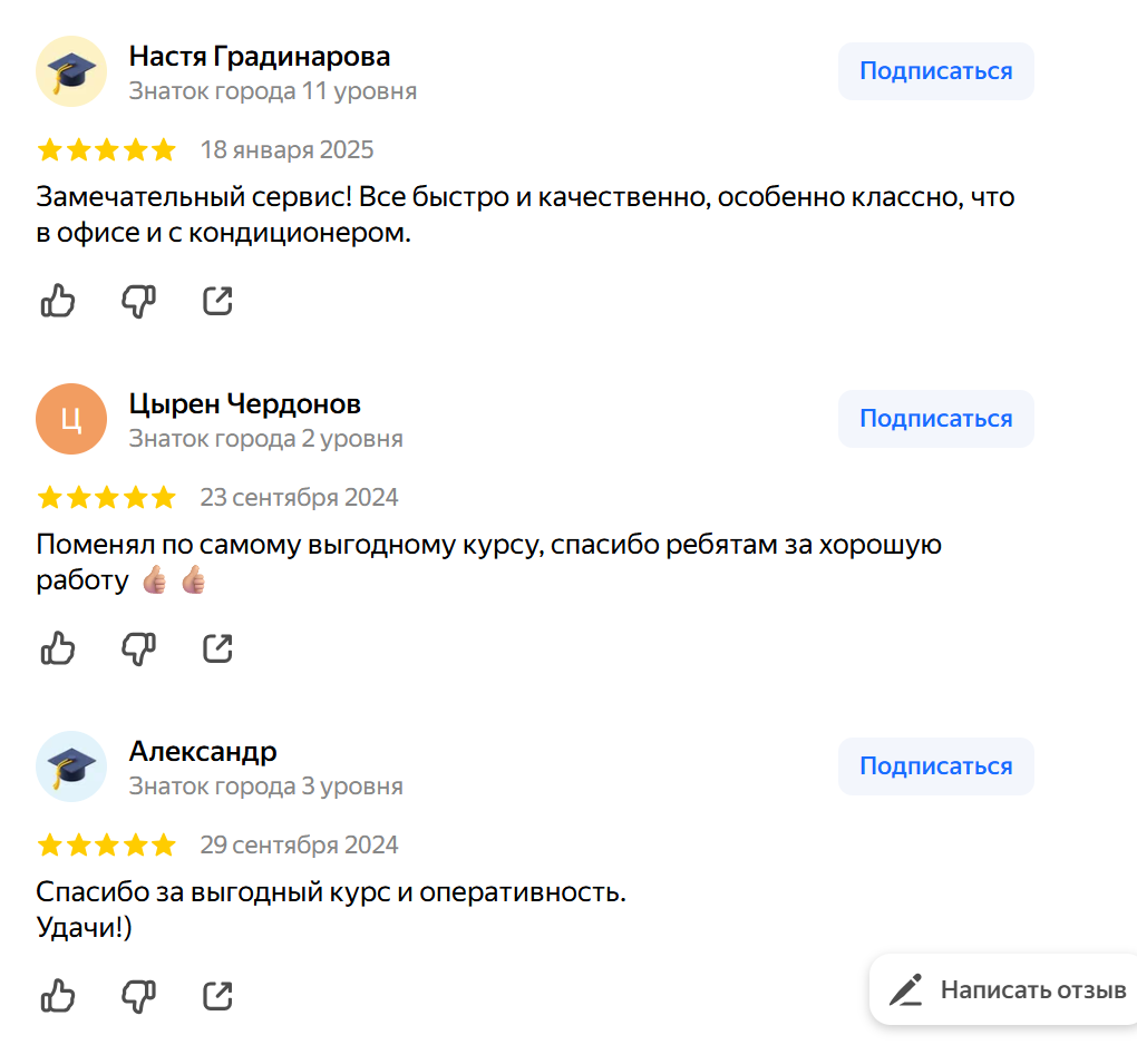 О валютном обменнике UlanExchange отзывы преимущественно положительные. Компания публикует их на своем сайте, размещает в отдельном Телеграмм канале, есть рецензии на сервис на Яндекс картах и Google Maps. Клиенты отмечают вежливый персонал, быстрые операции, надежность и выгодные курсы обмена. О комиссиях нигде не упоминается, скорее всего, всех пользователей они устраивают, значит, конкурентные.