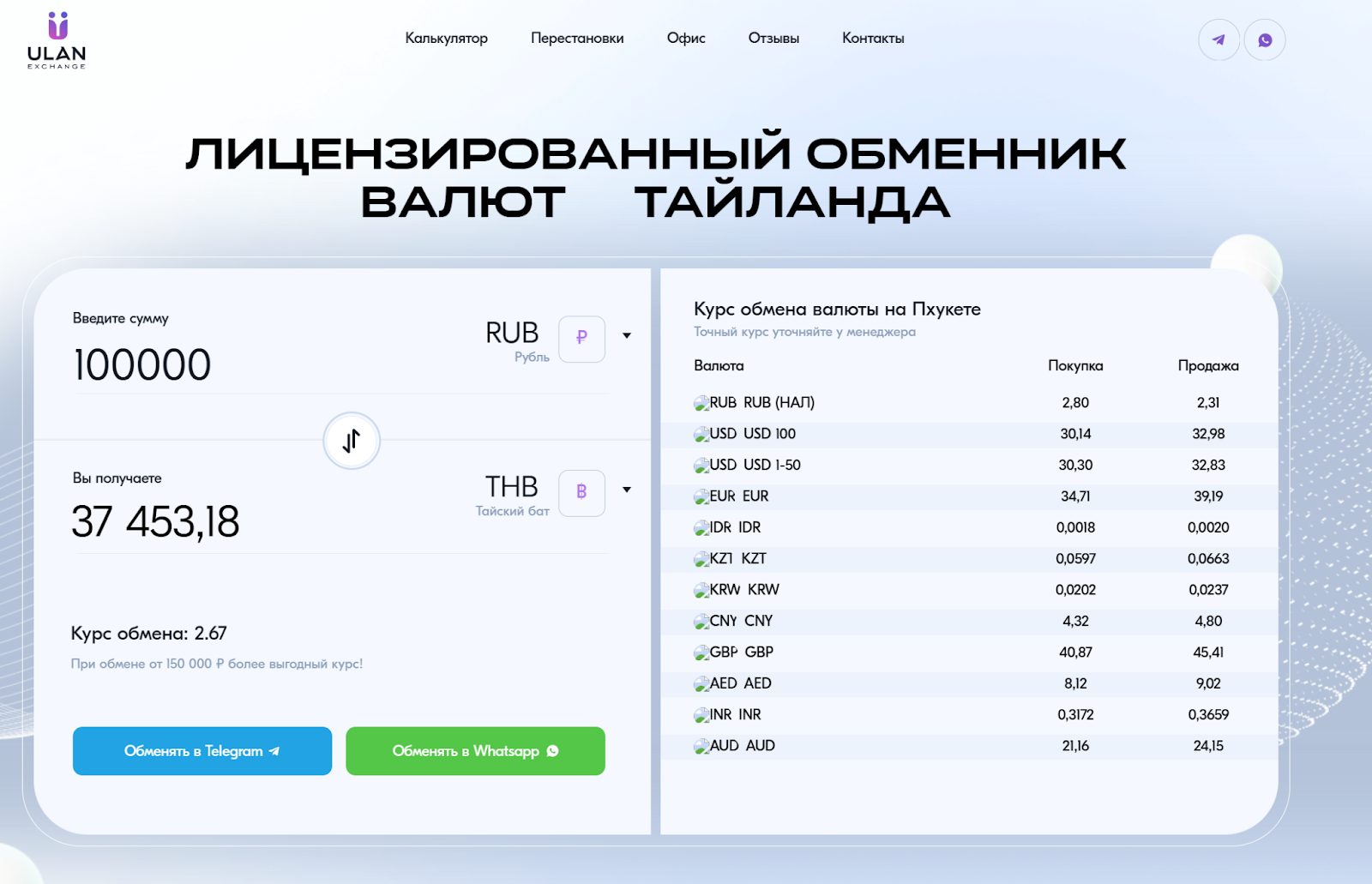 Ulan Exchange — валютный обменник, офис находится в Таиланде, но онлайн работа ведется по всему миру. Клиенты могут не только обменивать разные валюты, но и совершать международные переводы, оплачивать товары и услуги через посредника в лице обменника.