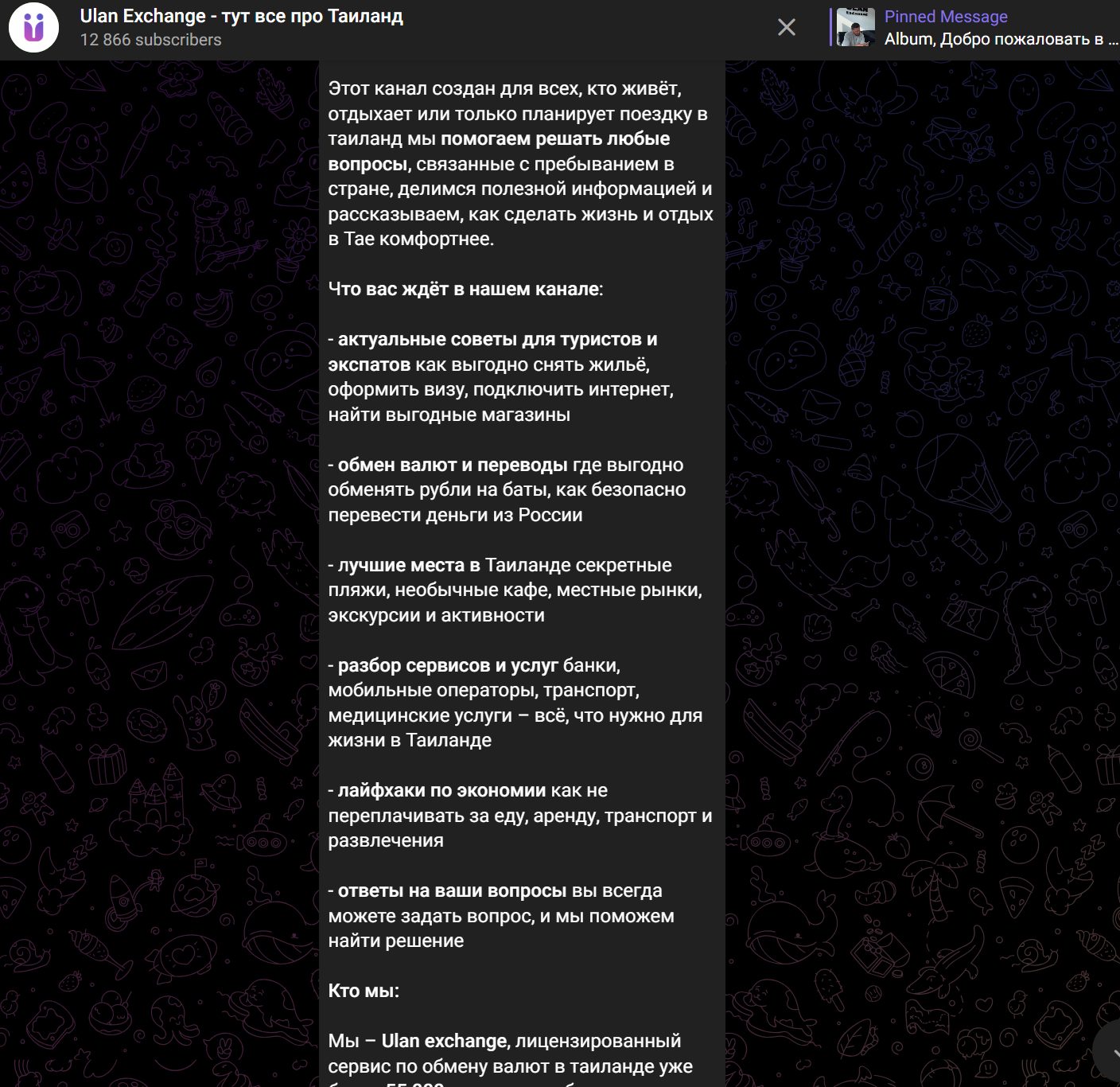 • Телеграмм Ulan Exchange тут все про Таиланд — аудитория почти 13 тысяч человек, в сообществе опубликованы советы для туристов, среди них есть посты об аренде транспорта, развлекательных мероприятиях, ресторанах и гостиницах, а также разбираются разные услуги от банков до медицины.