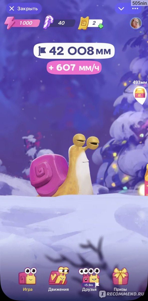 Интерфейс приложения весьма простой. На главной странице представлена сама улитка, которая двигается по снегу. В верхней части доступны достижения персонажа в плане леденцов, билетов и энергии. В основной части указывается текущая скорость и пройденное расстояние.