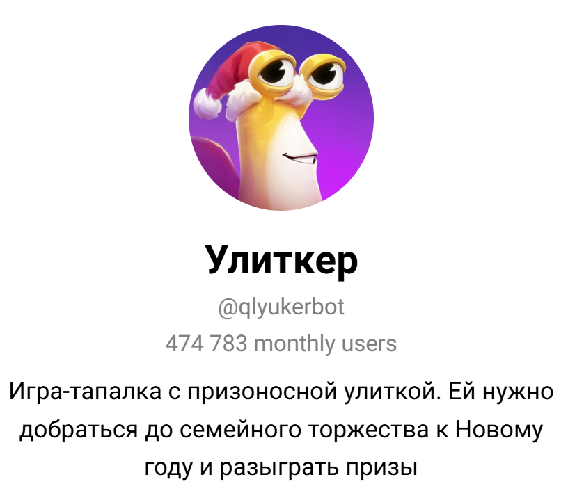 Рассматриваемый бот доступен по ссылке t me/qlyukerbot в Телеграмме. На конец декабря 2025-го приложение Улиткер собрало весьма солидную аудиторию в количестве около 474 тыс. пользователей. Последним предлагают дойти до торжества и поучаствовать в розыгрыше призов.