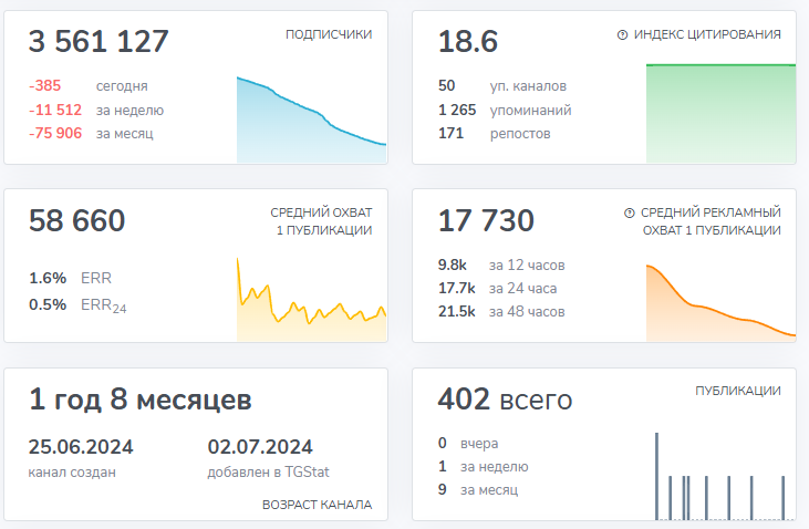 На март 2026 года на канале было 3 561 127 подписчика, однако публикации просматривает в среднем около 58 660 человек. Разрыв в 60 раз прямо указывает на накрутку аудитории.