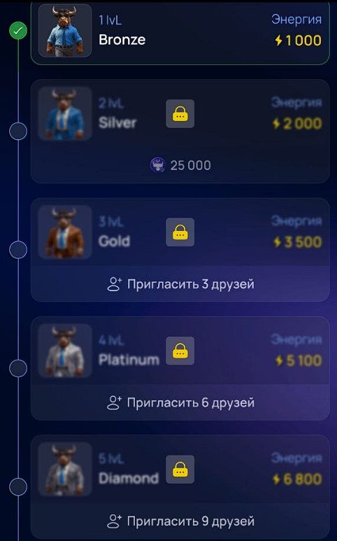 Ранговая система в Ultima Bulls насчитывает 15 ступеней – путь начинается с Bronze и заканчивается Hero. Подняться выше просто так не получится: каждый новый ранг требует выполнения заданий из раздела «Доход» и определенного запаса монеток UBT на балансе. Смысл прокачки рангов прямой – чем выше ступень, тем больше суточной энергии получает игрок и тем активнее растет его баланс за день.