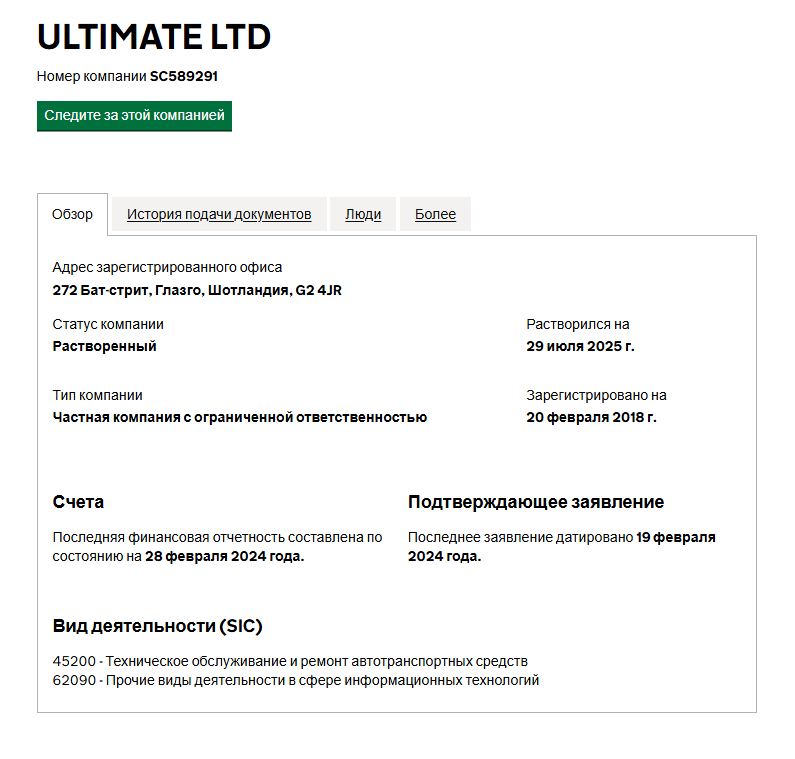 Однако называется она немного иначе – Ultimate Ltd. На данный момент она не работает, а ранее занималась техническим обслуживанием и ремонтом автомобилей и деятельностью в сфере информационных технологий. Об инвестициях и финансовых услугах тут речи не идет.