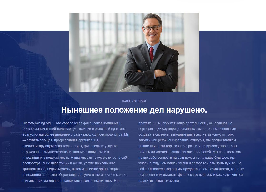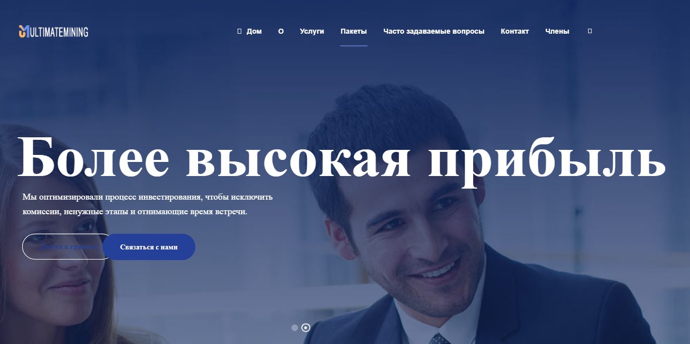 Инвестиционная платформа Ultimatemining расположена на сайте ultimate mining org. Это брокер, который предлагает клиентам зарабатывать на инвестициях. Уверяет, что в компании работают высококлассные специалисты, которые гарантированно помогут инвесторам получить высокий доход с внесенных депозитов.