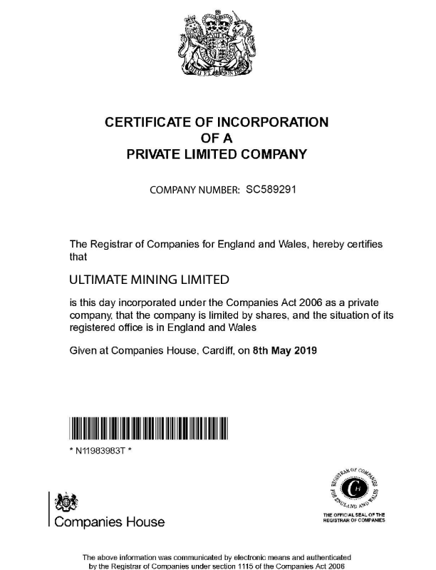 Владельцы прикрепили на сайте ссылку на сертификат, подтверждающий, что фирма работает официально. В документе компания названа как Ultimate Mining Limited и дан номер регистрации. Фирма с указанным регистрационным номером действительно существует, мы нашли ее в реестре.