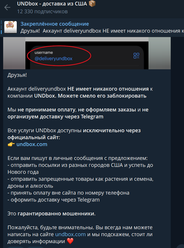 - Компания «УндБокс» честно предупреждает, что все сделки проходят только через официальный сайт, а не через мессенджеры, а это снижает риск столкнуться с мошенниками, которые выдают себя за сотрудников.