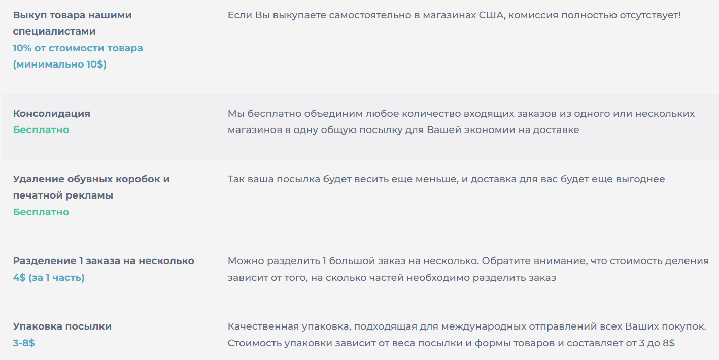 Сервис предлагает несколько типов услуг, о которых можно почитать на официальном сайте, например, выкуп товара обойдется в 10%, но не менее $10, а упаковка от $3 до $8.