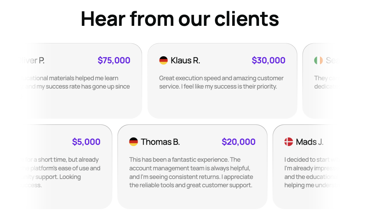 На главной странице Unifiedfinltd Com присутствовал блок Hear from our clients. В нем присутствовали сообщения от довольных клиентов этой площадки.