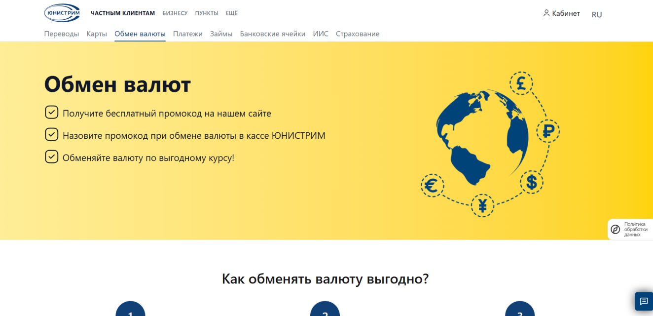 На сайте Юнистрим доступен обмен, а также информация про валюты, их курсы на сегодня. Для обмена необходимо выбрать пункт из предложенных. Для льготных курсов можно получить промокод на сайте, дождаться звонка менеджера. Промокод действует на сумму от 40 000 рублей. При отсутствии промокода процедура происходит стандартным методом, где нужно выбрать валютную пару, сумму и согласовать условия с менеджером.