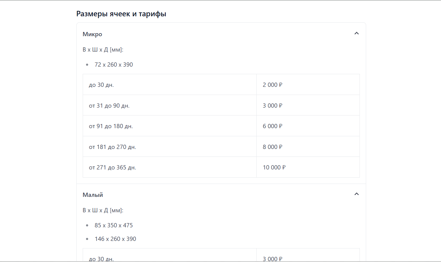 • микро (72 х 260 х 390). До 30 дней 2 000 руб., от 31 дня 3 тыс. руб., а максимальное время до 365 дней уже 10 тыс. руб.;