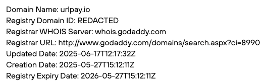 Основной показатель надежности финансовой платформы — это длительное время ее работы. С целью узнать, когда заработал сайт urlpay io, мы запросили данные его домена из WHOIS.