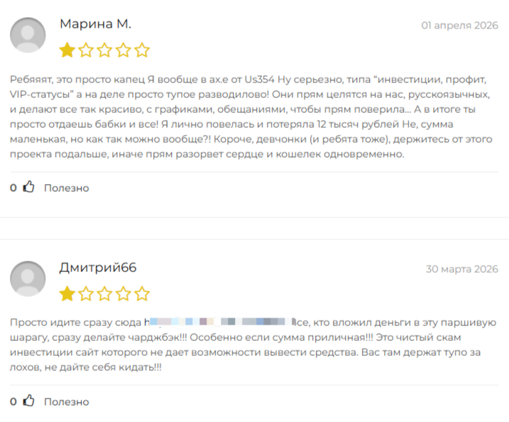 За свою недолгую жизнь новая инвестиционная платформа с массой красивых обещаний не получила позитивных комментариев. Мы не нашли в сети благодарностей организаторам проекта «Юс 354» за ежедневную прибыль и своевременные выплаты.