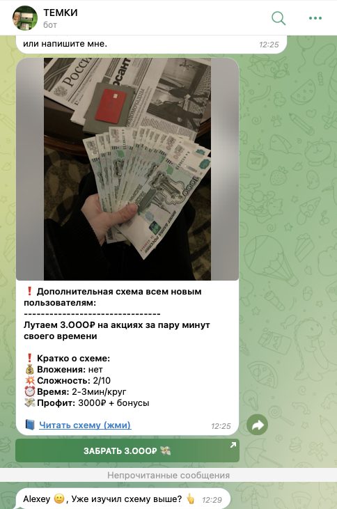 При подписке на телеграмм-канал «Успешный студент», располагающийся по адресу uspeshniy student, автоматически активируется бот «Темки». В него поступают сообщения, содержащие описание легких схем заработка.