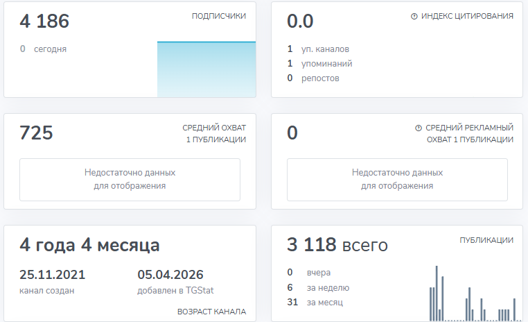 Канал запустили в ноябре 2021 года, на апрель 2026 года в нем 4 186 подписчиков. Комментарии закрыты, поэтому задать вопрос или обсудить заказ прямо в канале нельзя.