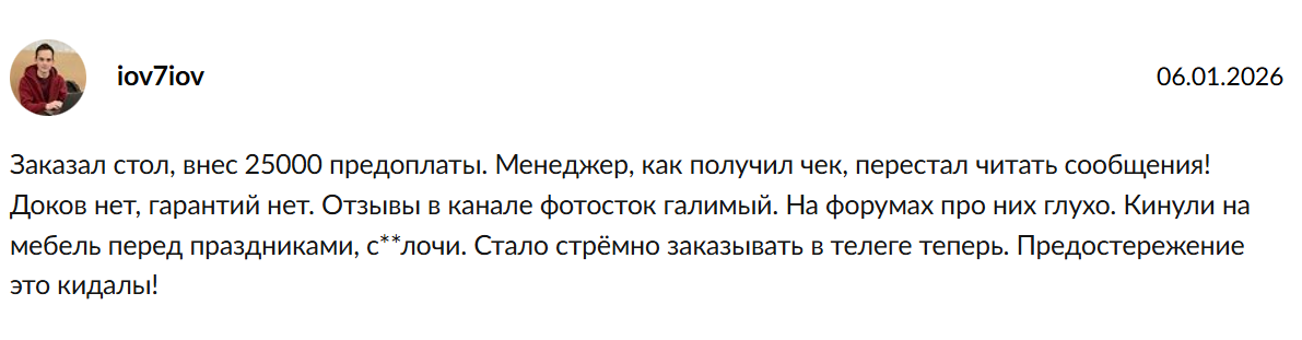 В сети нашелся один независимый отзыв о телеграмм-канале «Уютная Терраса». Покупатель внес крупную предоплату за стол, после чего менеджер перестал отвечать на сообщения. Никаких документов, подтверждающих заказ, не было, деньги вернуть не удалось.