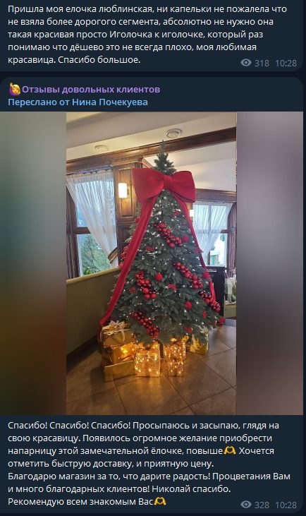 Администраторы ведут отдельный канал с отзывами клиентов. Опубликованные там комментарии положительные, но не содержат деталей о сроках доставки или состоянии товара при получении.