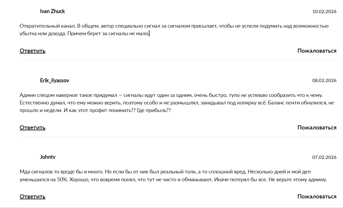 Многие пользователи отметили, что автор этого проекта является мошенником. В отрицательных комментариях трейдеры утверждают, что не смогли заработать. Сигналы автора тг-канала UZtrade привели их к серьезным убыткам. Положительных отзывов данный онлайн-проект не получил.