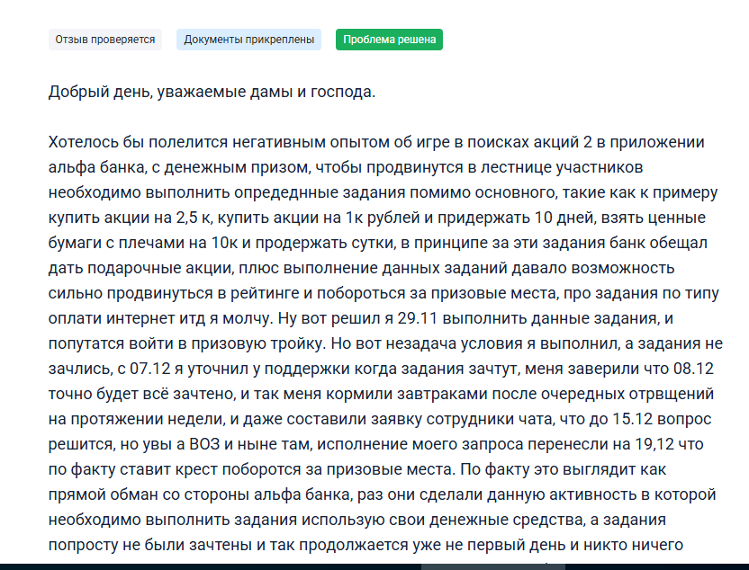 При этом часть участников пишут в отзывах, что инвестиции в игре В Поисках Акций 2 Альфа Банк себя не окупают. После настойчивых обращений задания все же засчитывались, а бонусы начислялись. Некоторые пользователи получили 300–900 рублей и остались удовлетворены результатом, однако эти случаи носят выборочный характер и не компенсируют общую непрозрачность механики.