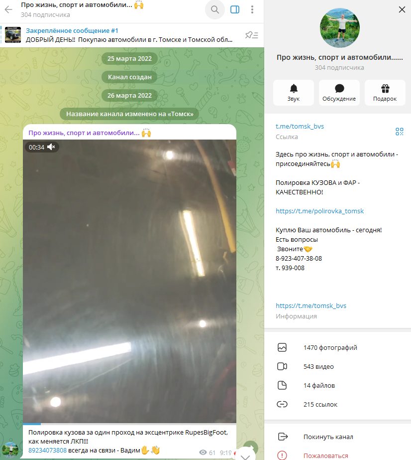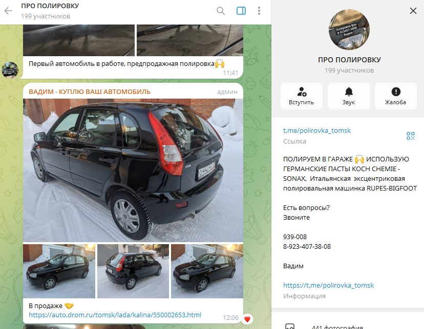 Дополнительно у автора есть чат в Телеграм, в котором он демонстрирует свои работы по полировке кузова и отдельных кузовных элементов автомобиля.