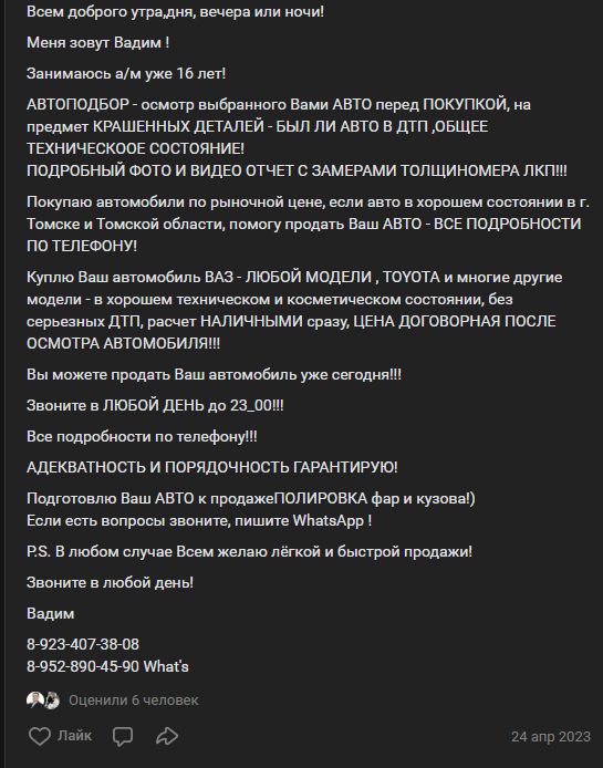 Автор занимается покупкой, продажей и подготовкой автомобилей. Насколько качественные услуги – неизвестно. Однако отметим, что предлагаемый ценник средний по рынку.