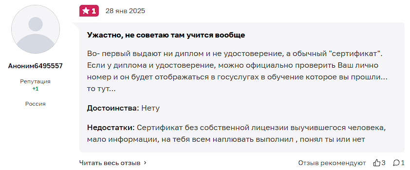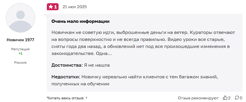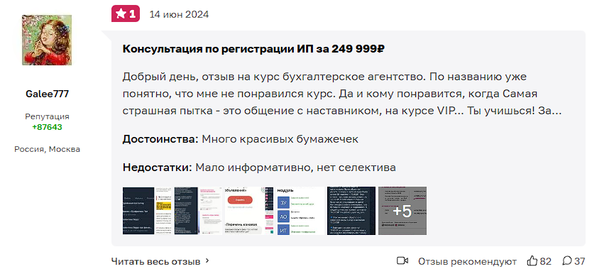 ИП Чирикова Валентина Лаврентьевна, несмотря на якобы богатый опыт в сфере бухгалтерии, получает негативные отзывы на форумах. Люди отмечают высокую стоимость материалов, где например, консультация по регистрации ИП стоила целых 250 000 рублей. Помимо завышенной цены клиенты жалуются и на низкую информативность, по их мнению найти клиента с таким багажом знаний после курса просто невозможно, а значит и заработать тоже.