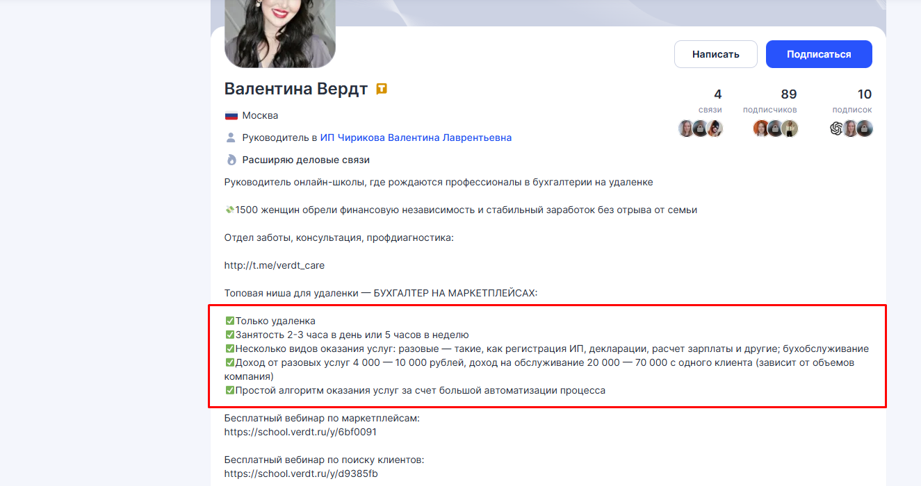 В своем блоге на различных ресурсах, типа TenChat / Telegram / Инстаграм, после прохождения курсов Валентина Вердт обещает занятость до 3 часов в день в сфере бухобслуживания с доходом до 70 000 рублей с одного клиента. При этом реальной статистики в открытых источниках нет, а сама предпринимательница больше напоминает инфоцыгана.