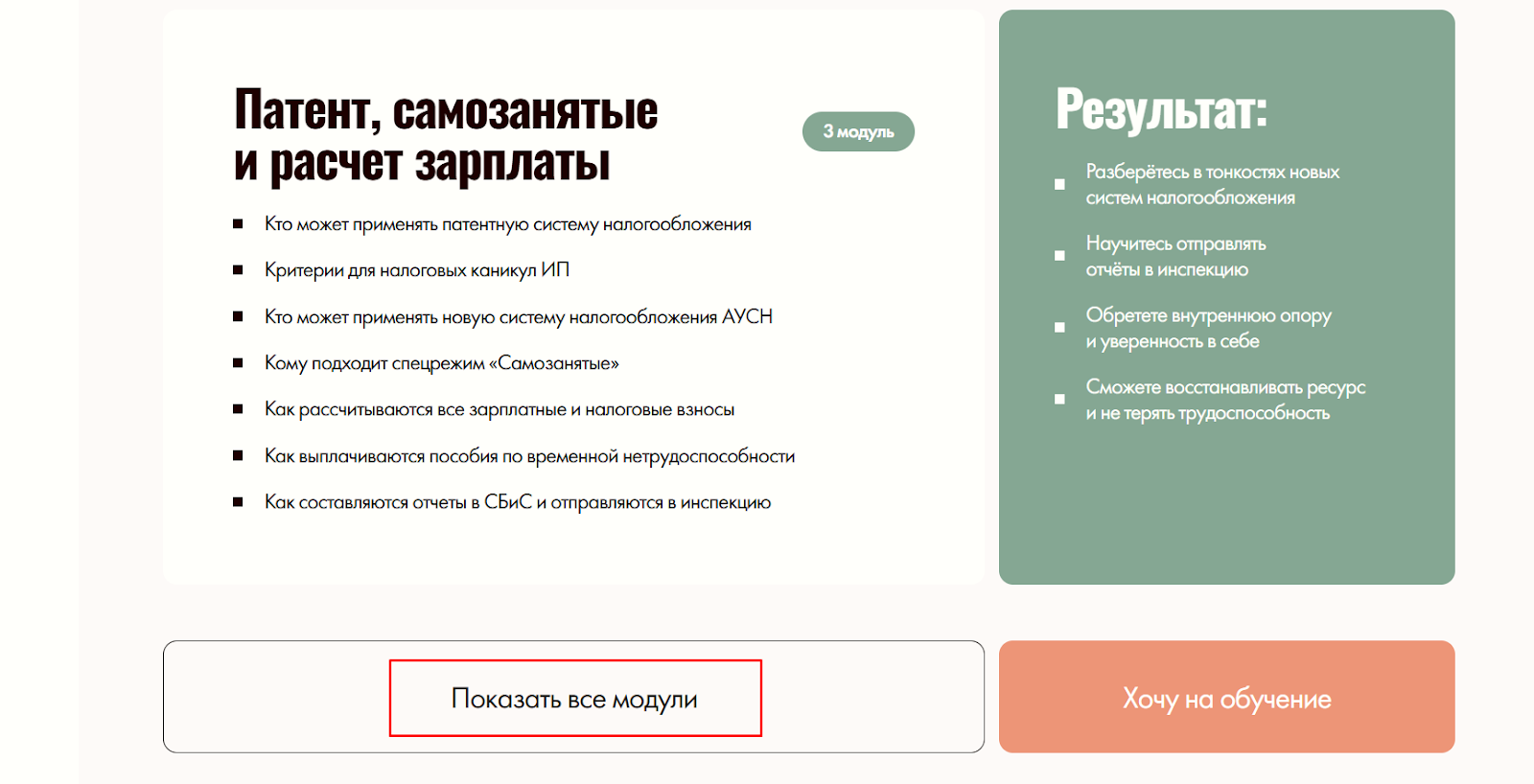 - 1 модуль: что делает бухгалтер, разница между ИП и ООО, налогообложение, работа с клиентом и страхи начинающих;