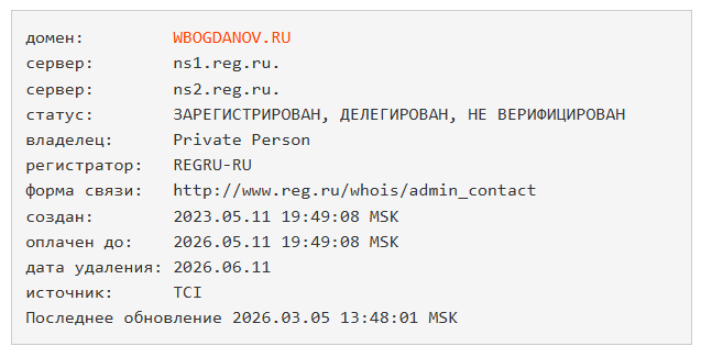 Данные с Whois говорят о том, что домен WBogdanov ru зарегистрировали только в середине 2023 года, что может указывать на продолжительный период работы.