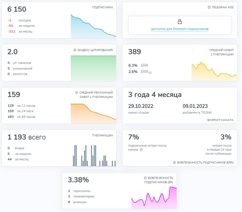 На канале в Телеграмм более 6000 пользователей, а создали проект в 2022 году, хотя всего 7% подписчиков просматривают посты, но вовлеченность составляет более 3%, хотя комментарии пользователи пишут редко. Статистика показывает, что в феврале 2026 года с проекта ушло довольно много участников, а это может говорить о снижении популярности или некачественном контенте.