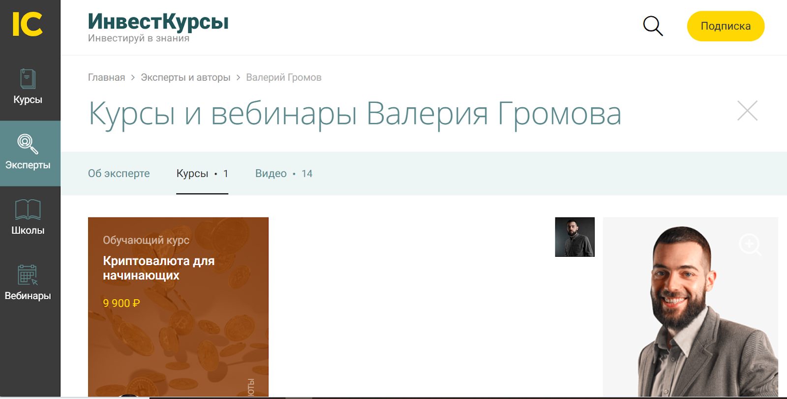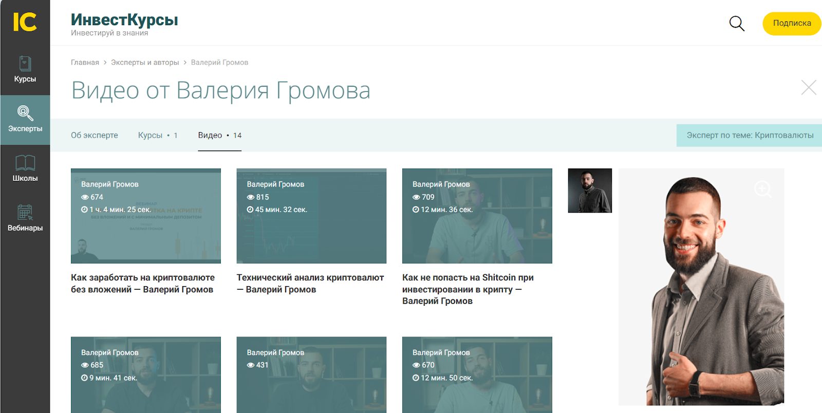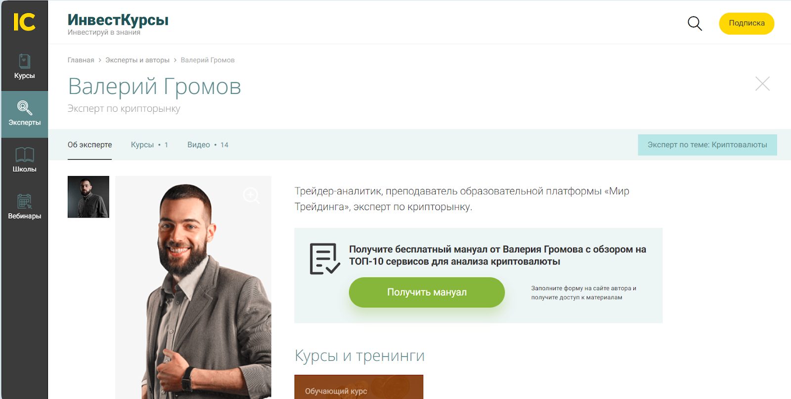 Валерий Громов – трейдер, который обучает работе с криптовалютами и финансовыми рынками. Он работает в рамках проекта «Мир Трейдинга» на платформе «ИнвестКурсы». В этой статье мы разберем что именно предлагает трейдер, на чем основывается его обучение и опыт. Кроме того, посмотрим на документы и проанализируем что о нем говорят и пишут клиенты в сети.