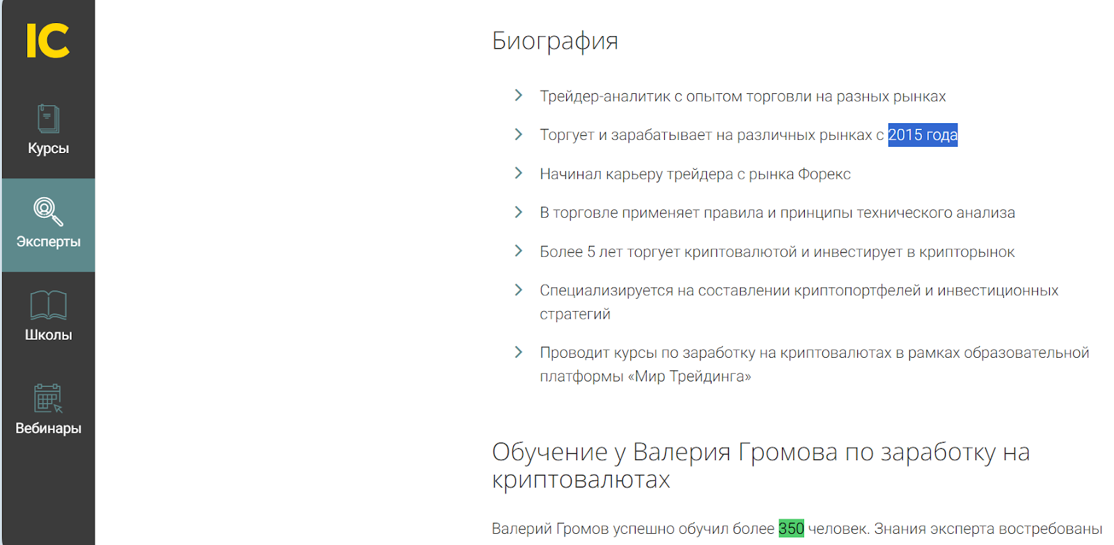 По описанию на сайте успешный трейдер торгует на рынках с 2015 года. Он начинал с Forex, а позже перешел в крипту и обучает новичков. Акцент на том, что это опытный трейдер, который умеет не просто покупать и продавать активы, а выстраивает стратегию.