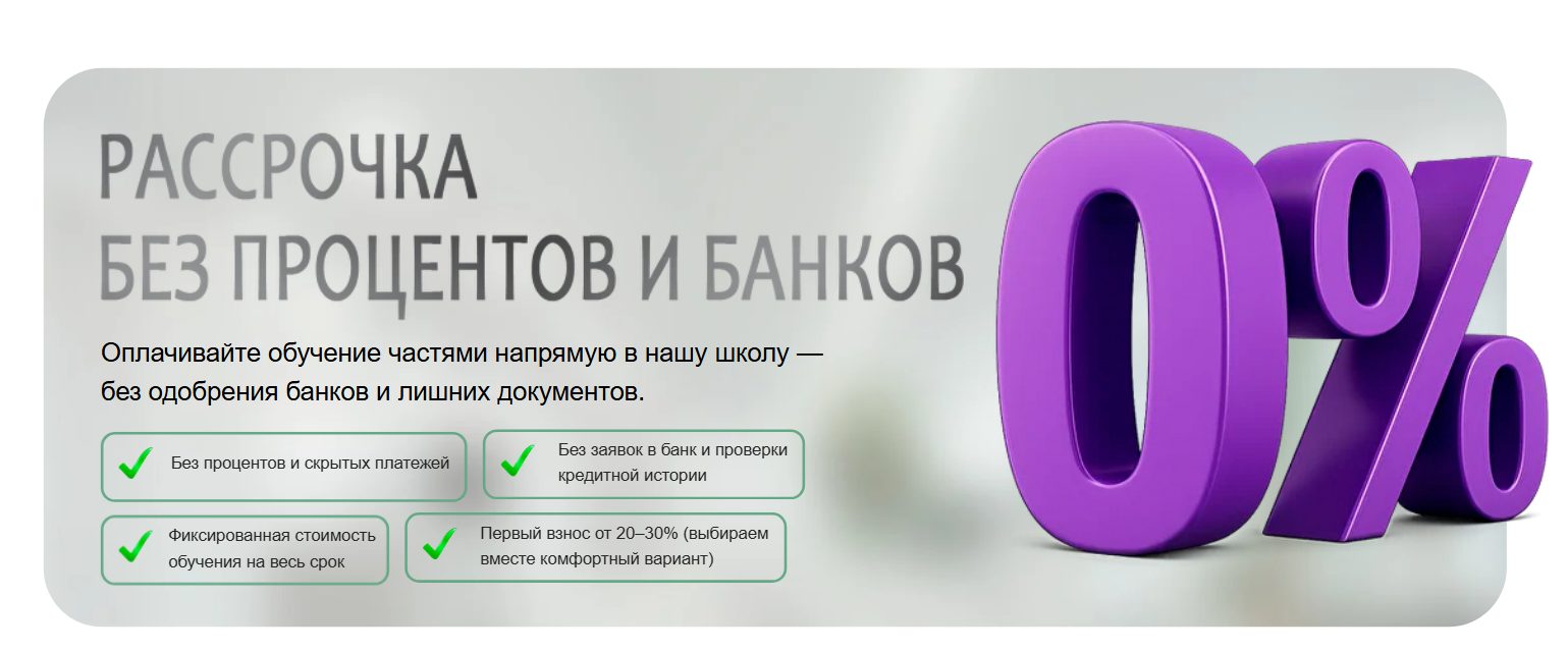 Оплата возможна в рассрочку без участия банков и начисления процентов. Платежи идут напрямую в школу Васила Закирова. Обязателен первый взнос – 20-30% от стоимости курса.