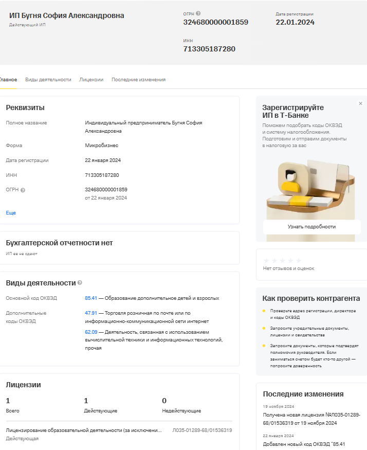 Школа Васила Закирова оформлена официально, но на другого человека – ИП Бугня София Александровна, и имеет лицензию на образовательную деятельность.