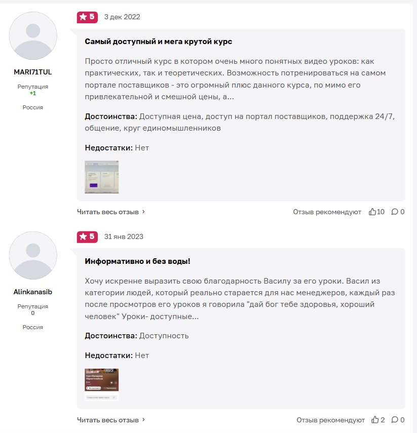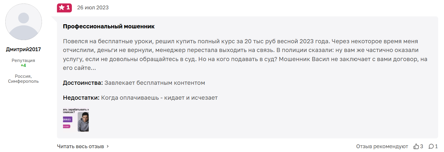 Отзывы о курсе «Менеджер маркетплейсов», который создал Васил Закиров, в интернете встречаются разные. Есть довольные ученики, которые отмечают пользу уроков, поддержку кураторов, доступные цены.
