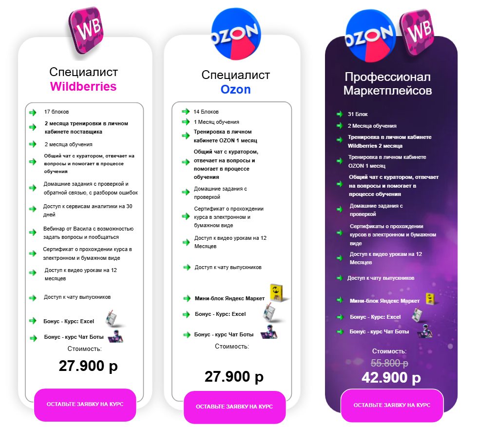 Обучение возможно по одному из трех тарифов. Первый предполагает только маркетплейс ВБ, второй – только «Озон», а третий объединяет обе площадки. Если ученик выбирает один маркетплейс, цена составляет 27 900 рублей, а если оба – 42 900.