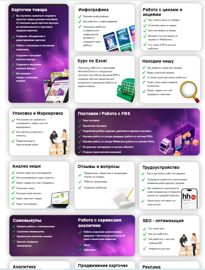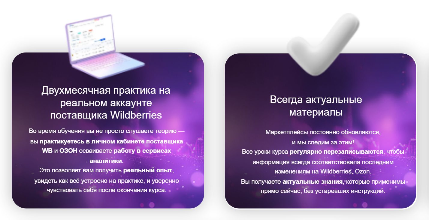 Ученикам предлагается не просто слушать теорию, а отрабатывать полученные навыки в реальном кабинете поставщика на маркетплейсе, а также применять сервисы аналитики. Васил уверяет, что вся информация в лекциях актуальная, она постоянно обновляется, поэтому не содержит устаревших данных.