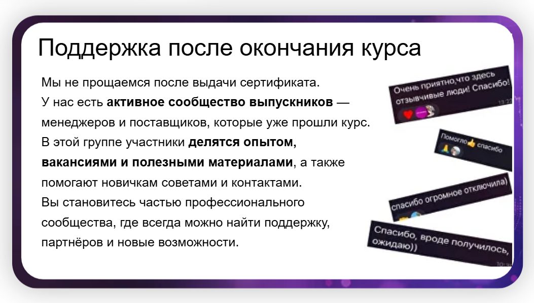После прохождения курса ученикам обещают поддержку кураторов и помощь в трудоустройстве. У проекта есть активное сообщество выпускников, где участники делятся ценным опытом, вакансиями, заводят полезные знакомства.
