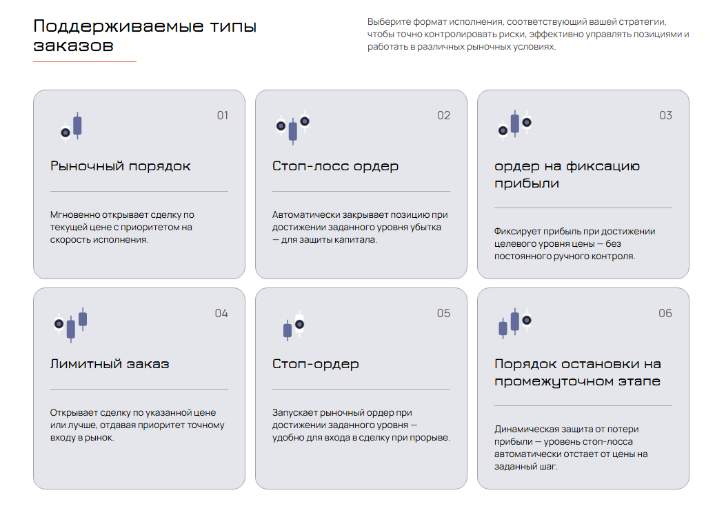 Такое разнообразие позволяет трейдерам практиковать разные стратегии и держать риски под контролем независимо от ситуации на рынке.