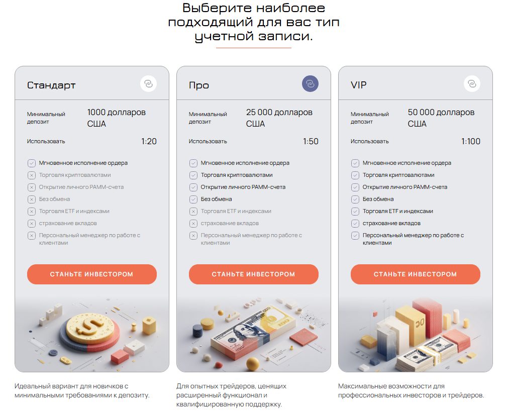 1. «Стандарт»: минимальный депозит – $250, торговое плечо 1:20. Нельзя торговать криптой, ETF и индексами, открывать PAMM-счет. Взнос не страхуется. Поддержка персонального менеджера отсутствует.