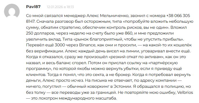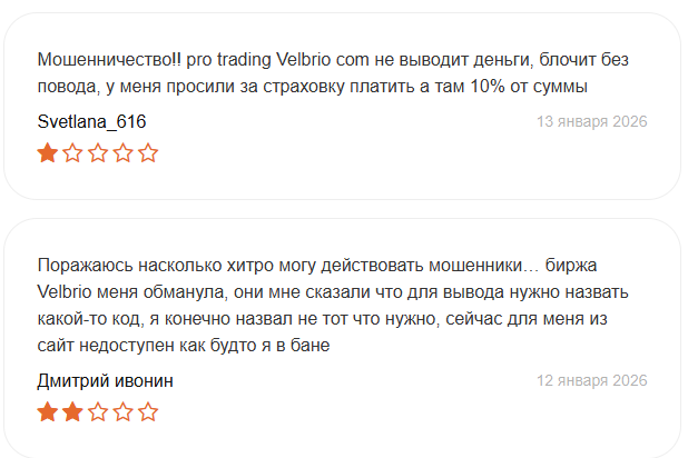 В сети можно найти множество жалоб на работу этого сервиса. Мы изучили реальные истории пострадавших. Люди подробно описывают схемы обмана. Положительных отзывов о Velbrio нет.