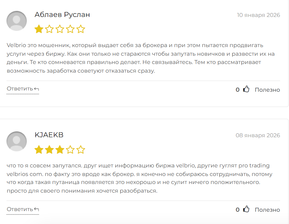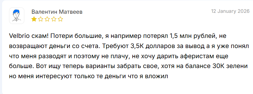 Отзывы о брокерской платформе velbrios com в сети отрицательные. Брокер не дает выводить деньги со счета, требует дополнительные платежи. Как только жертва понимает, что это развод, и перестает переводить средства, аферисты прекращают выходить на связь.